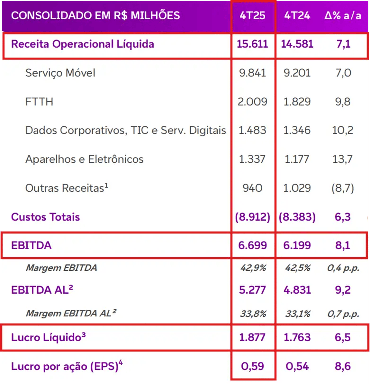 A operadora de telefonia apresentou uma receita líquida de R$ 15,6 bilhões no 4T25, aumento de +7% na comparação anual. No negócio móvel, a receita atingiu R$ 9,8 bilhões, alta de +7%, impulsionada pelo crescimento de +9% na receita de pós-pago, após aumento de +7% na base de clientes (atingiu 70,8 milhões) e reajustes anuais de preço.