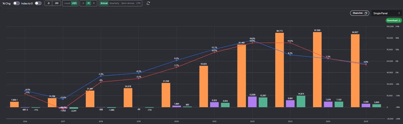 Aqui começa o desconforto. Atualmente, a Tesla é avaliada em cerca de US$ 1,4 trilhão, com um lucro líquido de apenas US$ 6 bilhões (com ajustes generosos). Isso implica um múltiplo próximo de 230x lucro.