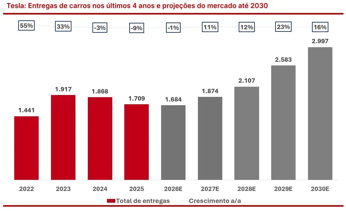 Apesar de um ambiente mais desafiador, o mercado continua projetando uma melhora a partir de 2027. Nas projeções, o número de veículos volta a expandir e, até 2030, as entregas chegariam a 3 milhões por ano, um crescimento médio anual de +12%.