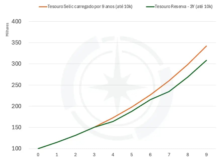 No curto prazo, Tesouro Reserva e Tesouro Selic caminham juntos. Com o passar dos anos, porém, o pagamento antecipado de imposto no Tesouro Reserva reduz o crescimento do capital, enquanto o Tesouro Selic se beneficia do diferimento tributário — uma diferença pequena no início, mas relevante no longo prazo.