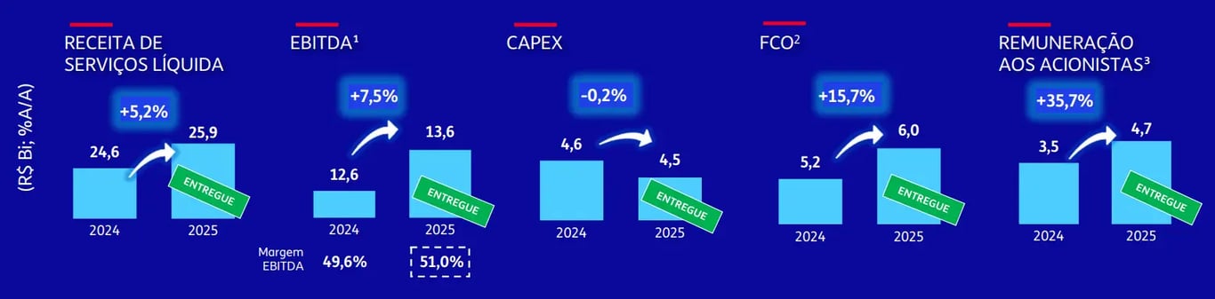 No ano, a soma de JCP, dividendos e recompra de ações totalizou R$ 4,7 bilhões, o que representa um crescimento de +36%. Inclusive, a companhia cumpriu todos os seus objetivos para 2025.