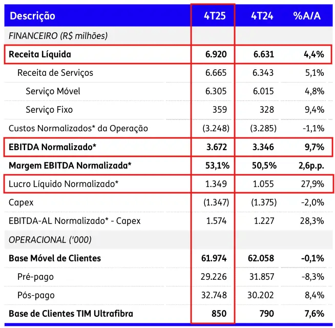 A TIM Brasil (TIMS3) reportou resultados acima do consenso de mercado, com uma receita líquida de R$ 6,9 bilhões no 4T25, crescimento de +4,4%, um Ebitda de R$ 3,7 bilhões (+9,7%) e um lucro líquido de R$ 1,3 bilhão (+28%). Todos os resultados foram comparados com o mesmo período em relação ao ano anterior.