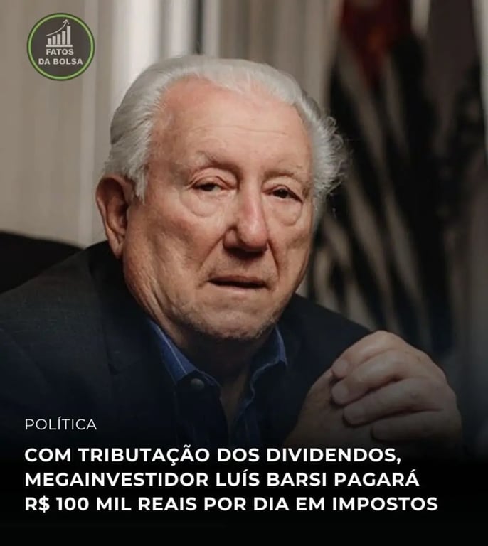 Dias atrás, me deparei com uma imagem impactante publicada pelo perfil Fatos da Bolsa: “Com a tributação dos dividendos, o megainvestidor Luís Barsi pagará R$ 100 mil por dia em impostos.”