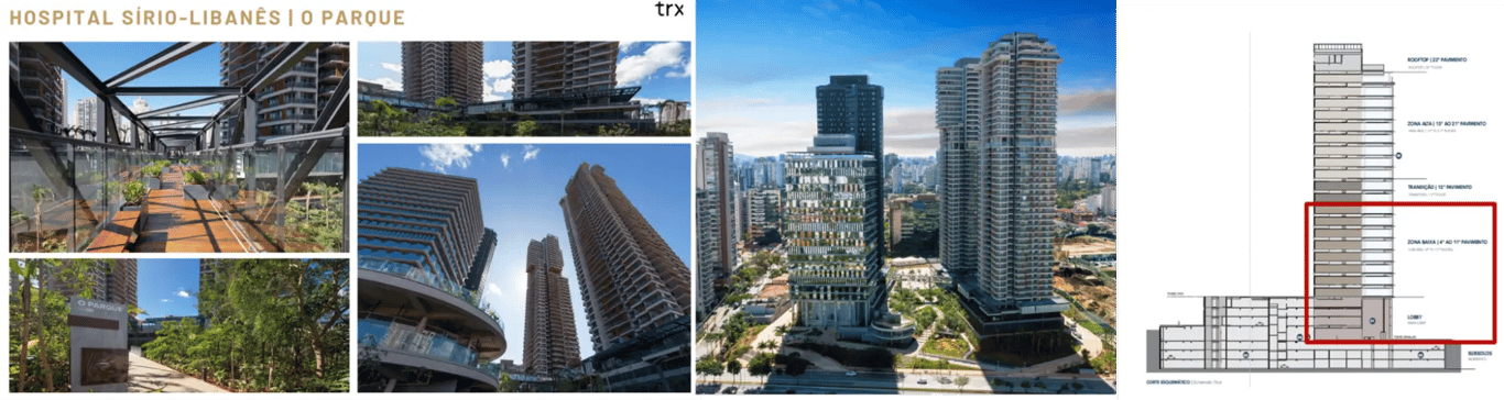 Portanto, trata-se de um empreendimento de uso misto, que reúne torres residenciais e comerciais, além de lojas e restaurantes. O Sírio-Libanês ocupa atualmente 9 pavimentos na Torre Corporativa Orvalho, um ativo classe A+, totalizando cerca de 10 mil m² de ABL.