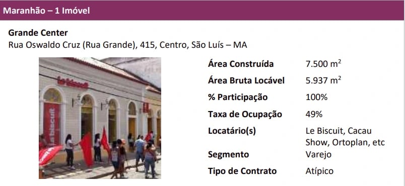 Por fim, o Grande Center, localizado em área central de São Luís, é um ativo multilocatário, com marcas como Casas Bahia, Americanas e Cacau Show. Apesar de não ter o padrão de grandes shoppings de capitais, funciona como um centro comercial regional, com bom fluxo de pessoas e relevância econômica para a cidade.