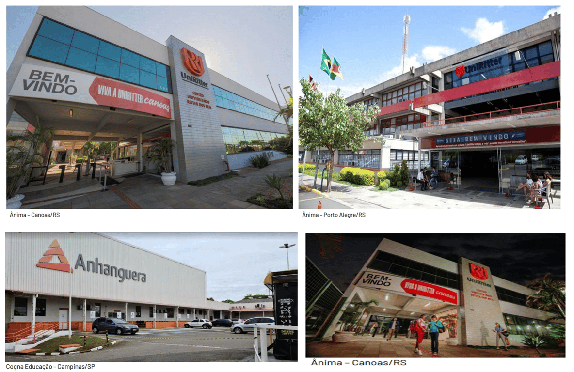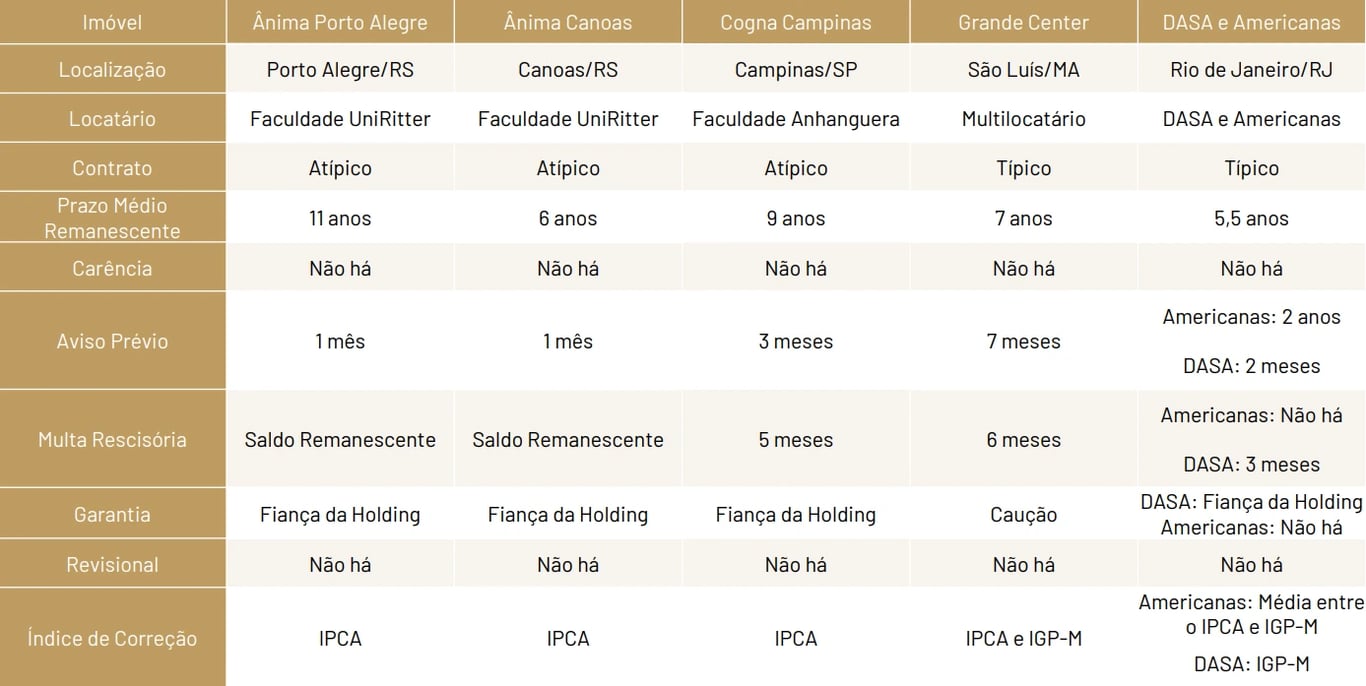 No Rio Grande do Sul, ficam os dois ativos educacionais locados para a Ânima, em Porto Alegre e Canoas. Em São Paulo, o portfólio inclui o imóvel educacional localizado em Campinas, ocupado pela Cogna.