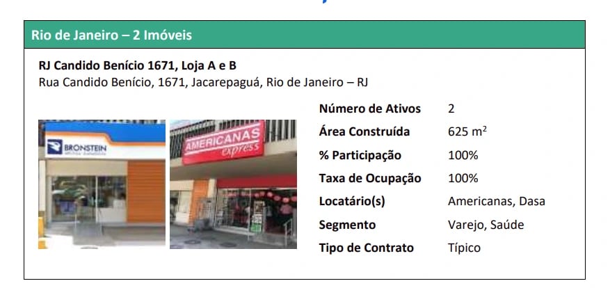 Já os imóveis de varejo de rua, ocupados por DASA e Americanas, estão em pontos bem localizados, com vocação comercial voltada ao entorno. Embora sejam operações mais simples, cumprem papel relevante no fluxo local e tendem a manter a ocupação por atenderem demandas do dia a dia da população.