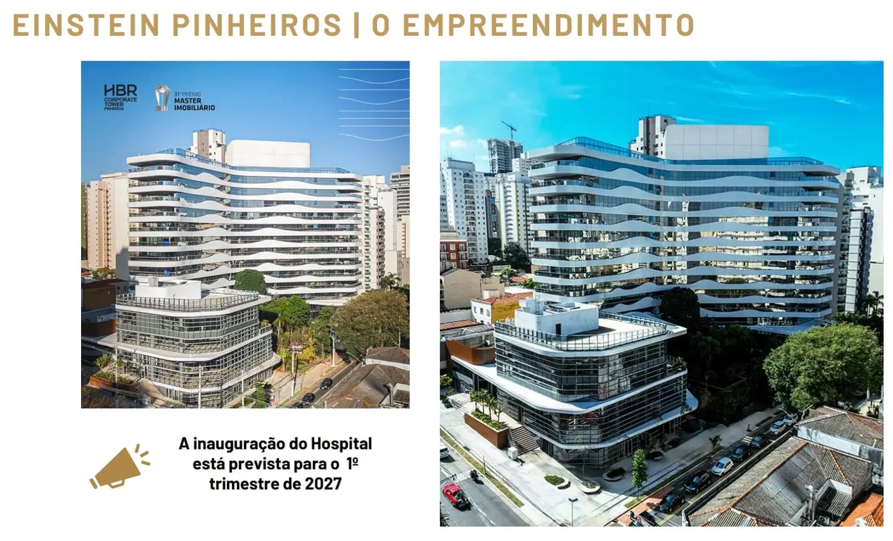 Assim como o hospital do Albert Einstein no Parque Global, já integrante do portfólio do Fundo, este novo imóvel mantém o padrão elevado de qualidade, aliado a um locatário de primeira linha, financeiramente sólido e amplamente reconhecido no segmento.