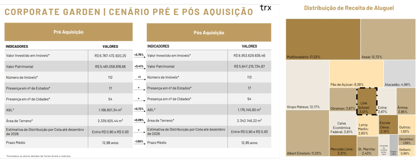 Após as novas aquisições, o TRXF passa a contar com 113 imóveis, espalhados por 17 estados e 54 cidades. A ABL total do portfólio atinge aproximadamente 1,17 milhão de m², enquanto a área de terreno soma cerca de 2,34 milhões de m². O valor investido em imóveis passa a ser próximo de R$ 6,95 bilhões, com patrimônio líquido em torno de R$ 5,64 bilhões.