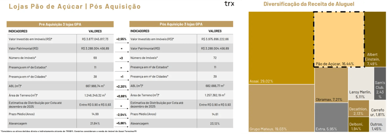 Os ativos são aderentes à estratégia do TRXF11, estão alugados a um inquilino com ótimo risco de crédito e a um cap rate que traz um retorno acima da média da carteira atual do fundo.