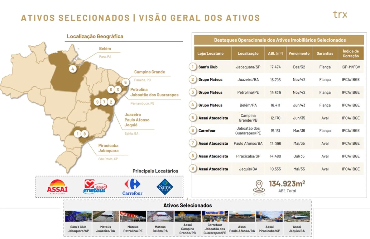 O TRXF11 informou a assinatura de um memorando de entendimento (MOU), para a venda de nove ativos, sendo eles: Sam’s Club Jabaquara/SP, Grupo Mateus Juazeiro/BA, Petrolina/PE, Belém/BA, Assaí Atacadista Campina Grande/PB, Paulo Afonso/BA, Piracicaba/SP, Jequié/BA, Carrefour Jaboatão dos Guararapes/PE.