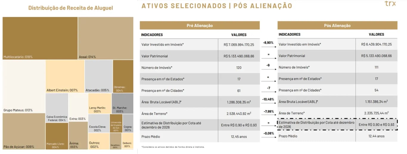 Após as alienações, o portfólio do TRXF11 permanece robusto e bem diversificado, com 111 imóveis distribuídos em 17 estados e 54 cidades. A ABL total passa a ser de aproximadamente 1,15 milhão de m², apoiada por uma área de terreno relevante, de cerca de 2,33 milhões de m². Já o valor patrimonial ajustado estimado do portfólio será de R$ 5,13 bilhões.