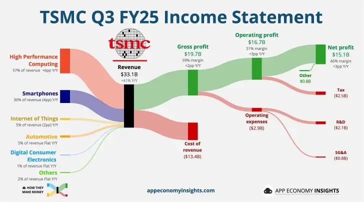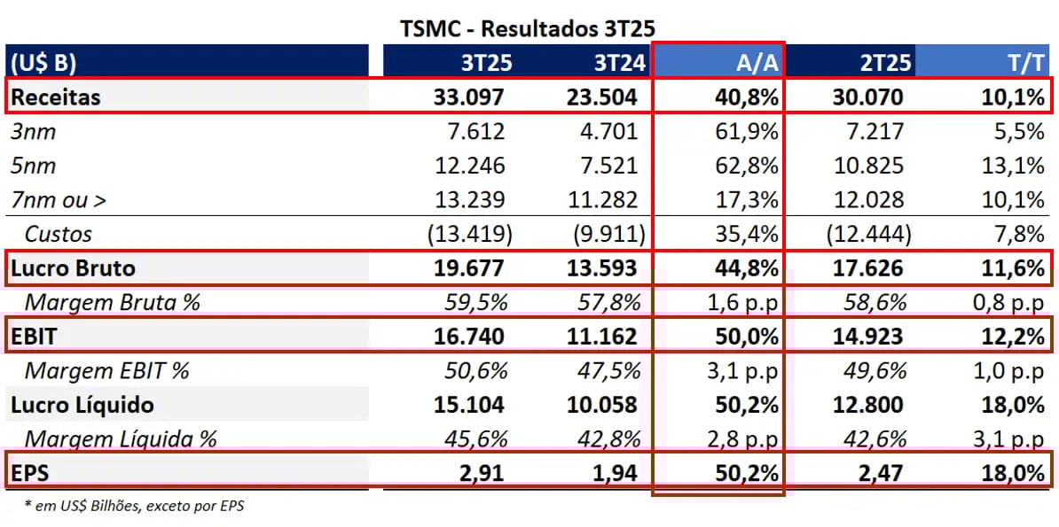 No 3T25, a TSMC registrou receita de US$ 33,1 bilhões, um crescimento de +40,8% em relação ao mesmo período do ano anterior e de +10% na comparação com o trimestre anterior. Para efeito de comparação, a média das projeções dos analistas apontava para uma receita de US$ 31,5 bilhões — a empresa superou a estimativa em +5%.