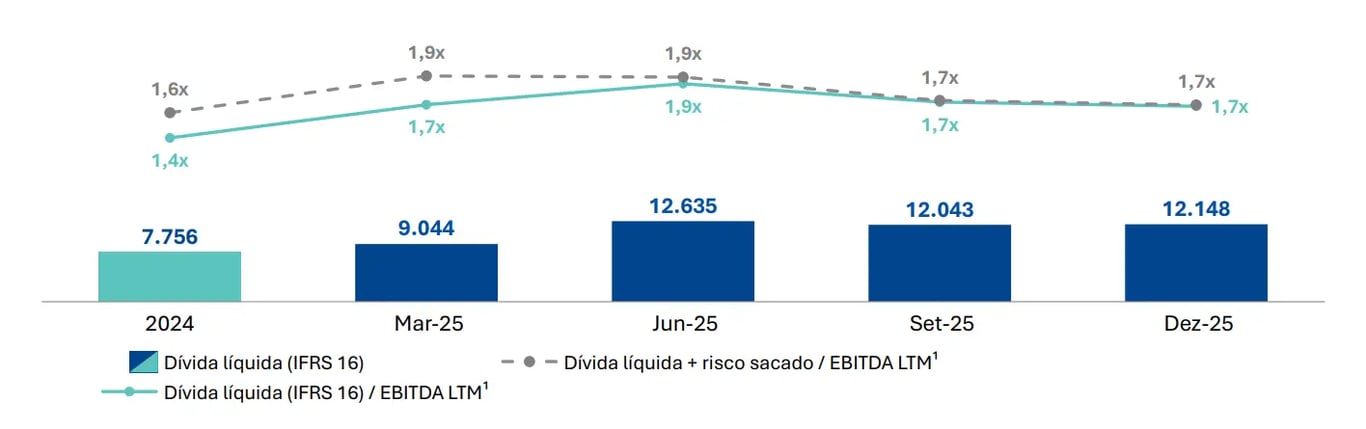O lucro líquido foi de R$ 256 milhões, representando uma forte queda de -71% na comparação anual. O resultado foi impactado principalmente pelo aumento das despesas financeiras, pela maior depreciação e amortização, além de efeitos extraordinários, como a baixa de ativos no 4T25 e o reconhecimento de créditos fiscais no 4T24.