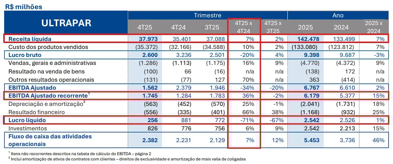 Principais destaques financeiros da Ultrapar (UGPA3) no 4T25