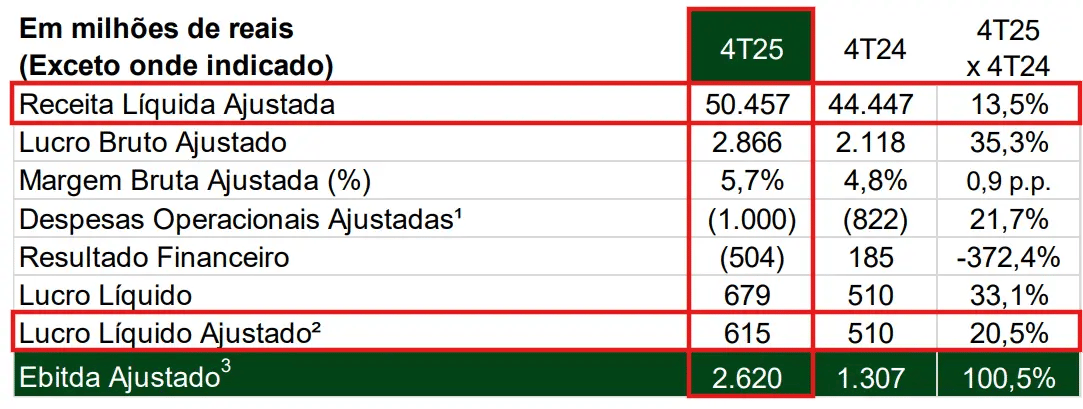 A Vibra (VBBR3) reportou resultados abaixo do consenso de mercado no 4T25, alcançando uma receita líquida de R$ 50,5 bilhões, representando um crescimento de +13,5%. O Ebitda ajustado foi de R$ 2,6 bilhões, alta de +100,5%, e o lucro líquido ajustado atingiu R$ 615 milhões, incremento de +20,5%, com todos os resultados comparados ao mesmo período do ano anterior.