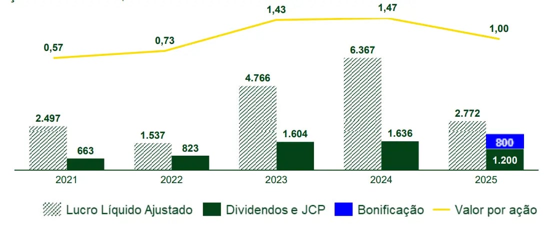 Em 2025, a Vibra anunciou R$ 1,2 bilhão em JCP, equivalente a R$ 1 por ação, o que representa um dividend yield de 3,2% aos preços atuais. Além disso, a distribuidora anunciou uma bonificação de R$ 800 milhões no ano.