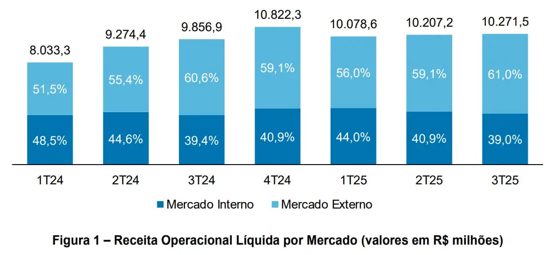 No consolidado, a receita da companhia cresceu +4%, com o mercado interno representando 39% e o externo, 61%.