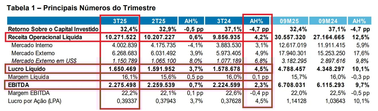 A WEG (WEGE3) reportou resultados em linha com o esperado no 3T25, com uma receita líquida de R$ 10,3 bilhões, um crescimento de +4%, um Ebitda de R$ 2,3 bilhões, +2% de alta e um lucro líquido de R$ 1,7 bilhão, expansão de +5%. Todos os resultados foram comparados com o mesmo período do ano anterior.